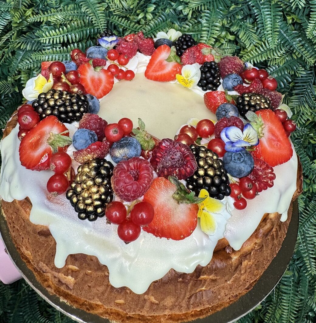 Sernik tradycyjny z polewą z białej czekolady i z owocami