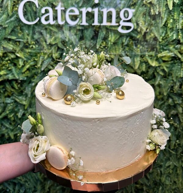 Przystrojony kwiatami i makaronikami